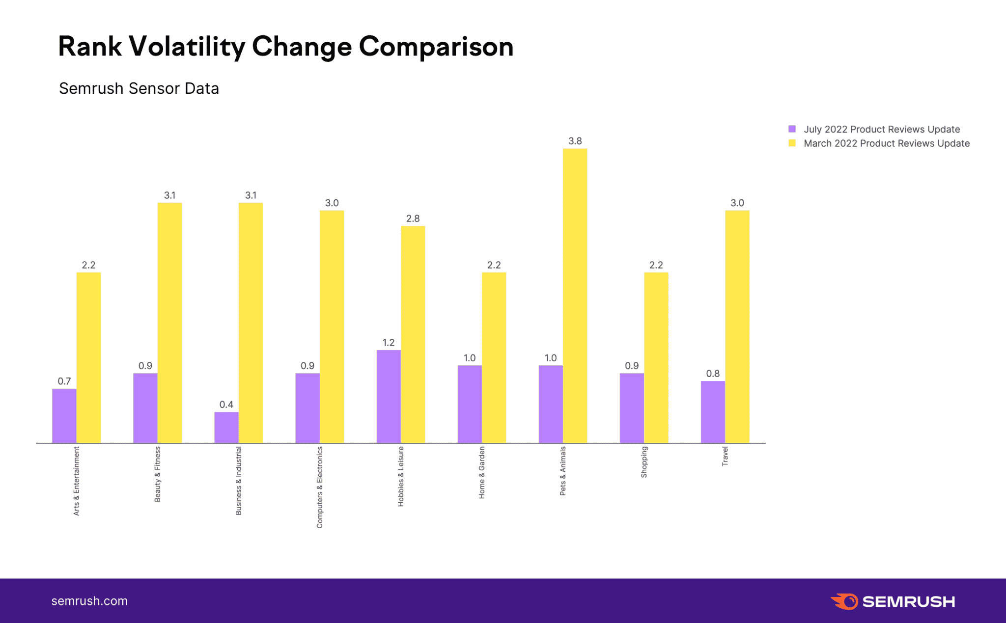 The change in rank volatility between the July 2022 product reviews update and the March 2022 product reviews update, the data shows that the increases are minimal. Some niches “didn’t even crack a full point increase, the highest fluctuation rate the Semrush Sensor recorded during the update,” Mordy Oberstein added.