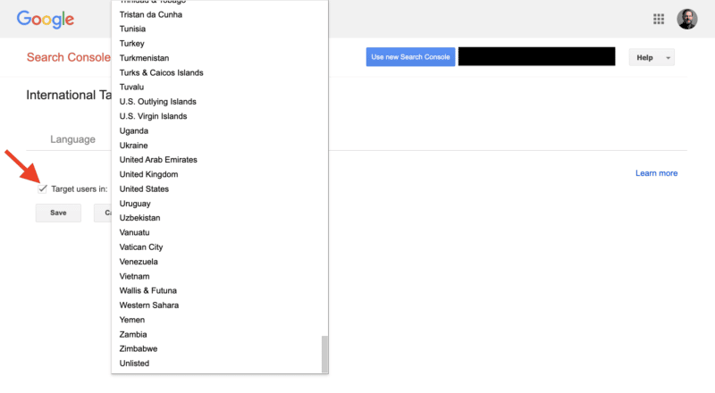 - In the left-hand navigation, expand the Legacy tools and reports section and click Internation targeting.