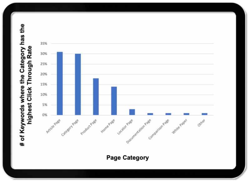 5. Article and category pages dominate ecommerce. Category pages have the highest click-through rate 70% of the time. Also of note: articles about products have higher click-through rates than product pages themselves, according to BrightEdge.