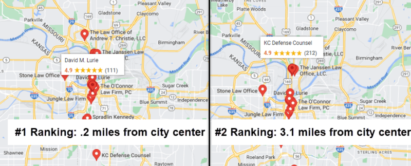 In the image below, a search for “kansas city defense attorney,” a highly desirable keyword for defense attorneys in Kansas City, the #1 ranking is held by a law firm that is located .2 miles from the city center of Kansas City. The #2 ranking business is located 3.1 miles from the city center.