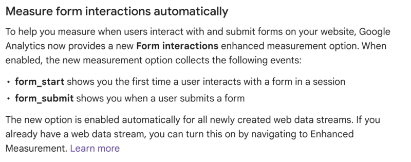 Google has added an enhanced measurement option for Form interactions. Now you can not only see when a form has been submitted, but you can also see when one has been started by a new user.