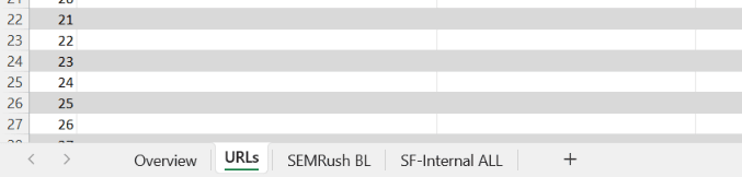 I put my ScreamingFrog data and Semrush data into separate sheets and created a Google Sheets file: