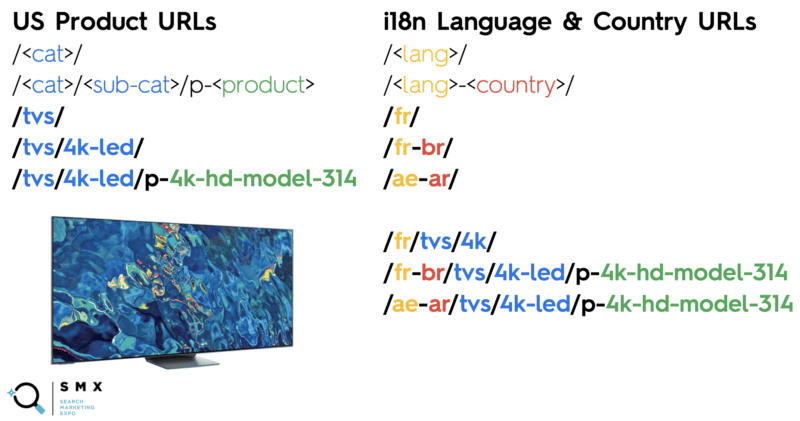 The site’s international product URLs included language and country codes, whereas U.S. product URLs did not.
