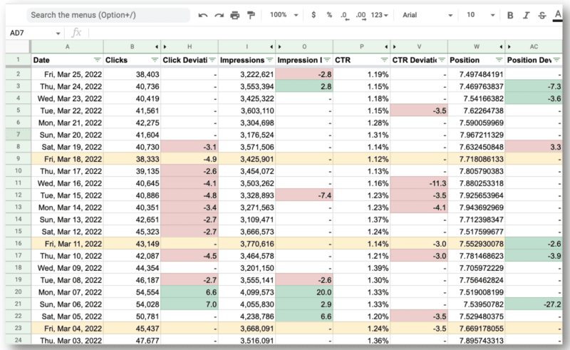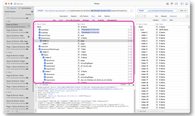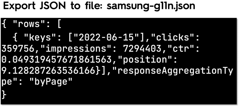 The response from Google is similar to that of the GSC API web view. The data can then be exported for processing.
