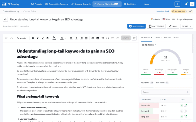 There is a range of content tools on the market, but for the purpose of this article, we’ll illustrate how to automate your content creation by using SE Ranking’s content tool, the Content Marketing Platform. It helps you craft content briefs in just a few minutes and write full-fledged articles in as little as a few hours.