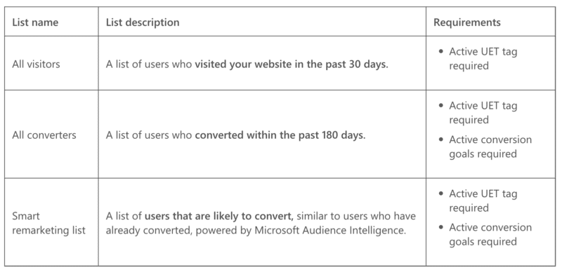 Auto-generated remarketing lists. There are now three types of lists to boost performance. Microsoft says “Smart remarketing lists have been proven to drive increased performance across the Microsoft Search and Audience Networks. Advertisers who leverage these lists see a 92% increase in click-through rate (CTR) and a 45% reduction in cost-per-acquisition (CPA) when they use these lists on the Microsoft Search Network.1 On the Audience Network, we see a 67% improvement in CTR and an 11% reduction in CPA.”