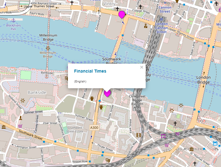 The following is an example when zooming into central London, where you’ll see the Financial Times’ office location.