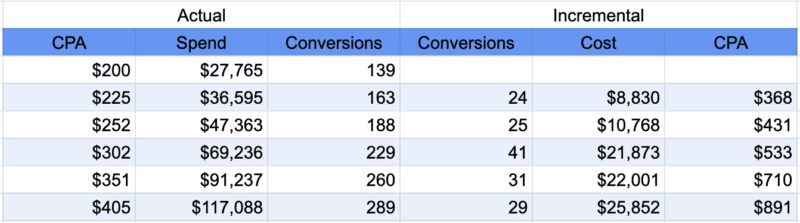 For example, in the table above, going up from a total CPA of $351 to $405 is only a 15% increase in CPA. However, the incremental CPA is $891 or 120% above the total CPA of $405.