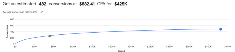 Google will then create an output that looks like the one below. It creates a curve that provides the expected output of conversions for a variety of spend inputs.