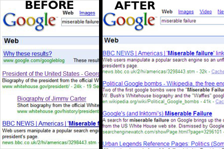 Read all about it in Google Kills Bush’s Miserable Failure Search & Other Google Bombs and Happy First Birthday, Google Bomb Fix!
