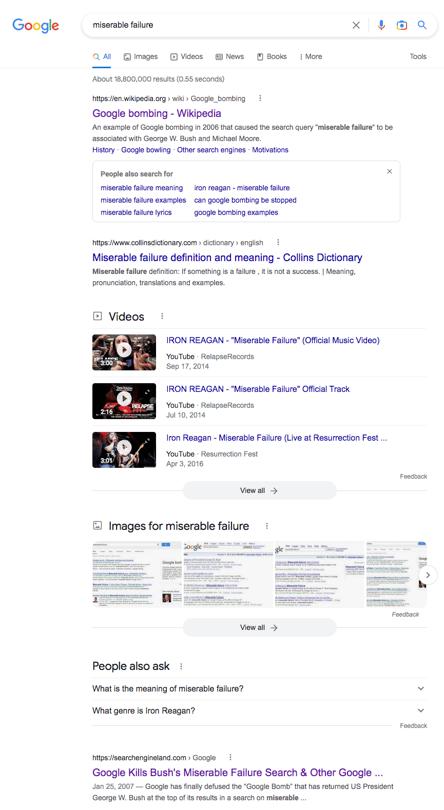 Today, here’s what a search for [miserable failure] looks like on Google – with Wikipedia’s Google bombing page in the top spot.